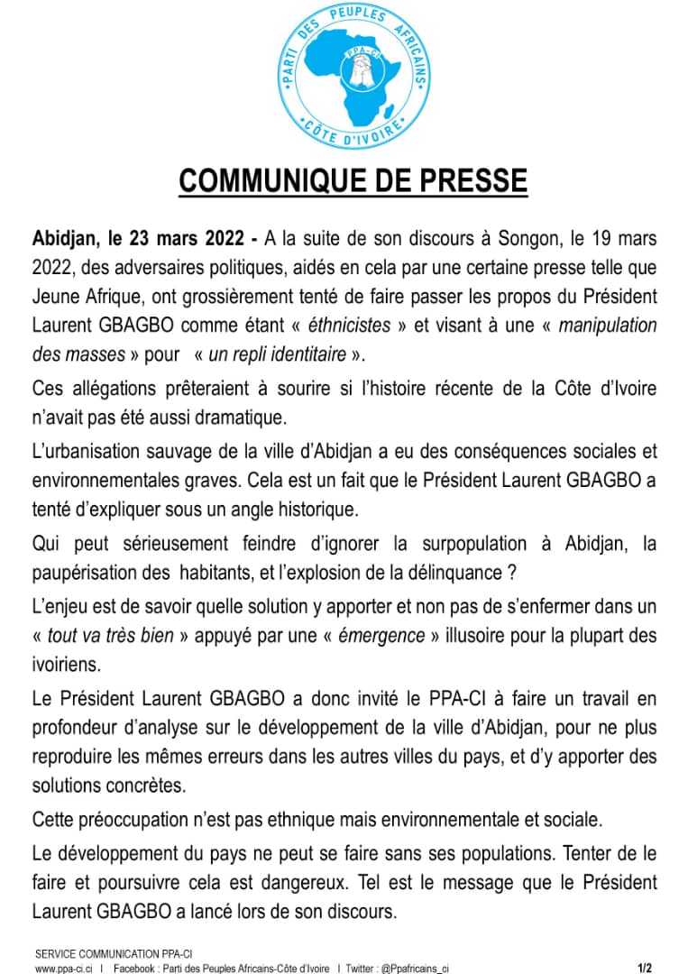 Actualité Après sa sortie à Songon Agban-Le PPA-CI dénonce la “manipulation” du discours de Laurent Gbagbo Publié 4 ans le 24 mars 2022 Par Redaction Share Tweet Tags:Laurent GbagboLe PPA-CIsortie à Songon Agban A lire aussi Elections législatives 2025- Jour de vérité entre candidats après la campagne Politique- Sidiki Konaté rafraîchit la mémoire à Charles Blé Goudé après son uppercut contre Nady Bamba Politique- Sanctionné Stéphane Kipré remercie Gbagbo et réaffirme son militantisme au PPA-CI DERNIERES INFO Xiaomi renforce son leadership sur le segment milieu de gamme et célèbre le lancement du REDMI Note 15 en Côte d’Ivoire 24 janvier 2026 Transport aérien- Air Côte d’Ivoire accroît ses vols vers Paris et facilite le voyage entre Paris et Abidjan 22 janvier 2026 programme COCOAPERATION : Des résultats encourageants et une détermination commune à poursuivre le développement 20 janvier 2026 Assemblée nationale- Assalé Tiémoko veut plus de retransmission des activités parlementaires [Réaction] 17 janvier 2026 Affaire 541 ha d’Akoupé-Zeudji ׀ Touré Ahmed Bouah et Amon Amon Athanas : Une confrontation loin de prendre fin 16 janvier 2026 NOS PARTENAIRESLAURORE’ TAGSAbidjan (70) Affi N'guessan (125) Afrique (305) Ahmadou BAKAYOKO (72) Alassane Ouattara (810) Amadou Coulibaly (83) Amadou Koné (421) Angleterre (83) Bouaké (303) Burkina Faso (88) CEDEAO (111) CIE (136) Conseil des ministres (84) Covid-19 (150) Culture (71) Côte d'Ivoire (4638) Duekoue (83) Football (176) FPI (119) France (245) Gendarmerie Nationale (80) Guillaume Soro (125) Hamed Bakayoko (74) Henri Konan Bédié (148) justice (97) Laurent Gbagbo (223) Mali (134) Ministère de la Santé (82) ministère des Transports (228) ok (1971) Patrick Achi (244) PDCI-RDA (234) Pierre Dimba (76) police nationale (218) Politique (113) PPA-CI (118) RHDP (500) Santé (125) SODECI (103) Sport (172) Sécurité (120) Sécurité routière (77) top (84) Yamoussoukro (112) Éducation nationale (95)