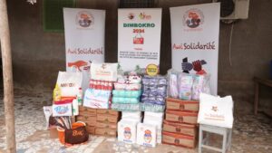 Pour donner le sourire à cette famille qui a ouvert sa maison afin de recueillir les orphelins et enfants abandonnés, la fondation AWI a offert des cartons de riz, de la tomate, de la pâte alimentaire, des produits d’hygiène, des Tee-Shirts, des serviettes hygiéniques, des paquets de couches pour bébé, du lait ainsi que la somme de 50 000 FCFA.