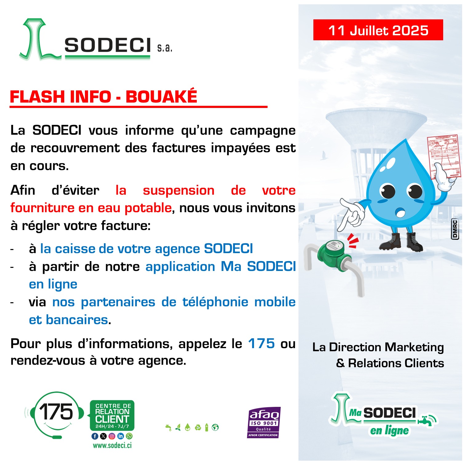La clientèle de la Société de distribution d’eau en Côte d’Ivoire- SODECI- de la direction régionale de Bouaké est informée par une note d’information émanant de la direction marketing et relations clients qu’une campagne de recouvrement des factures impayées est en cours.