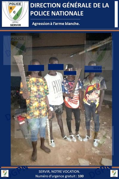 Au cours des différentes opérations menées du 30 mai au 1er juin 2022, quatre individus armés de machettes et ayant violemment agressé des personnes du quartier Nimbo (Bouake) ont été interpellés. Il s’agit de KN 19 ans, MB 16 ans, SA 16 ans et DM 18 ans” indique la Police dans sa note d’information. Elle précise que “Ces derniers ont tous été déférés” et “plusieurs armes blanches ont été saisies.”