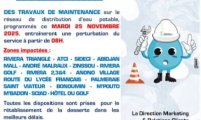 La clientèle SODECI de la Riviera sera privée d’eau potable mardi à partir de 8h pour cause de travaux de maintenance sur le réseau de distribution...