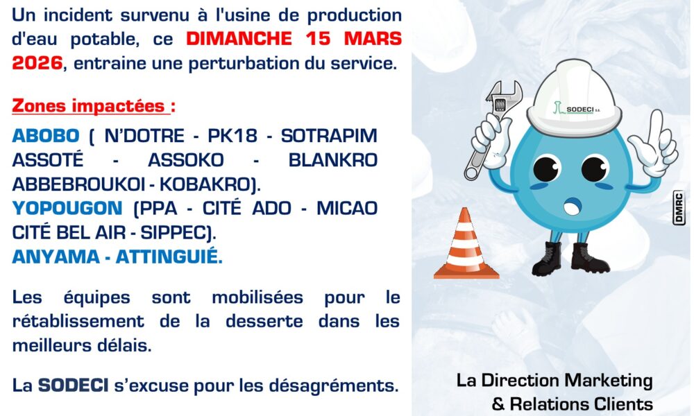 Les populations de Marcory, Koumassi, Zone 4, Vridi, Port-Bouët, Zone industrielle Vridi, Aéroport et Adjahui vont connaître une perturbation dans la fourniture de l’eau potable...