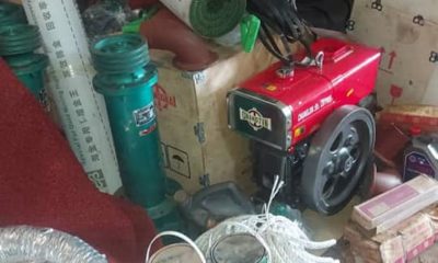 06 tuyaux flexibles de 06 m ; 04 moteurs diesel plus accessoires ; 06 baguettes de soudure ; 4 pompes mécaniques ; 45 barres de fer...