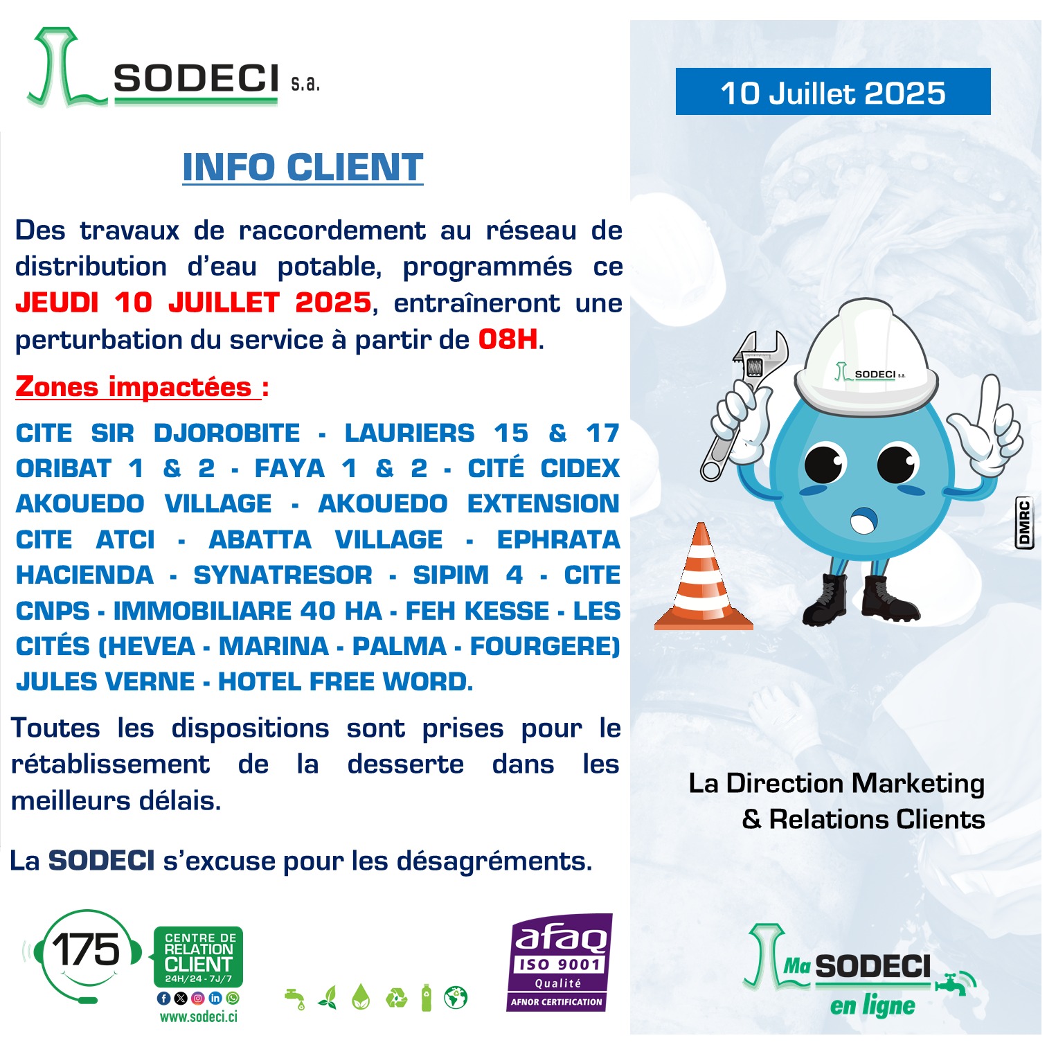 Cocody: perturbation de la distribution d’eau potable ce 10 juillet 2025