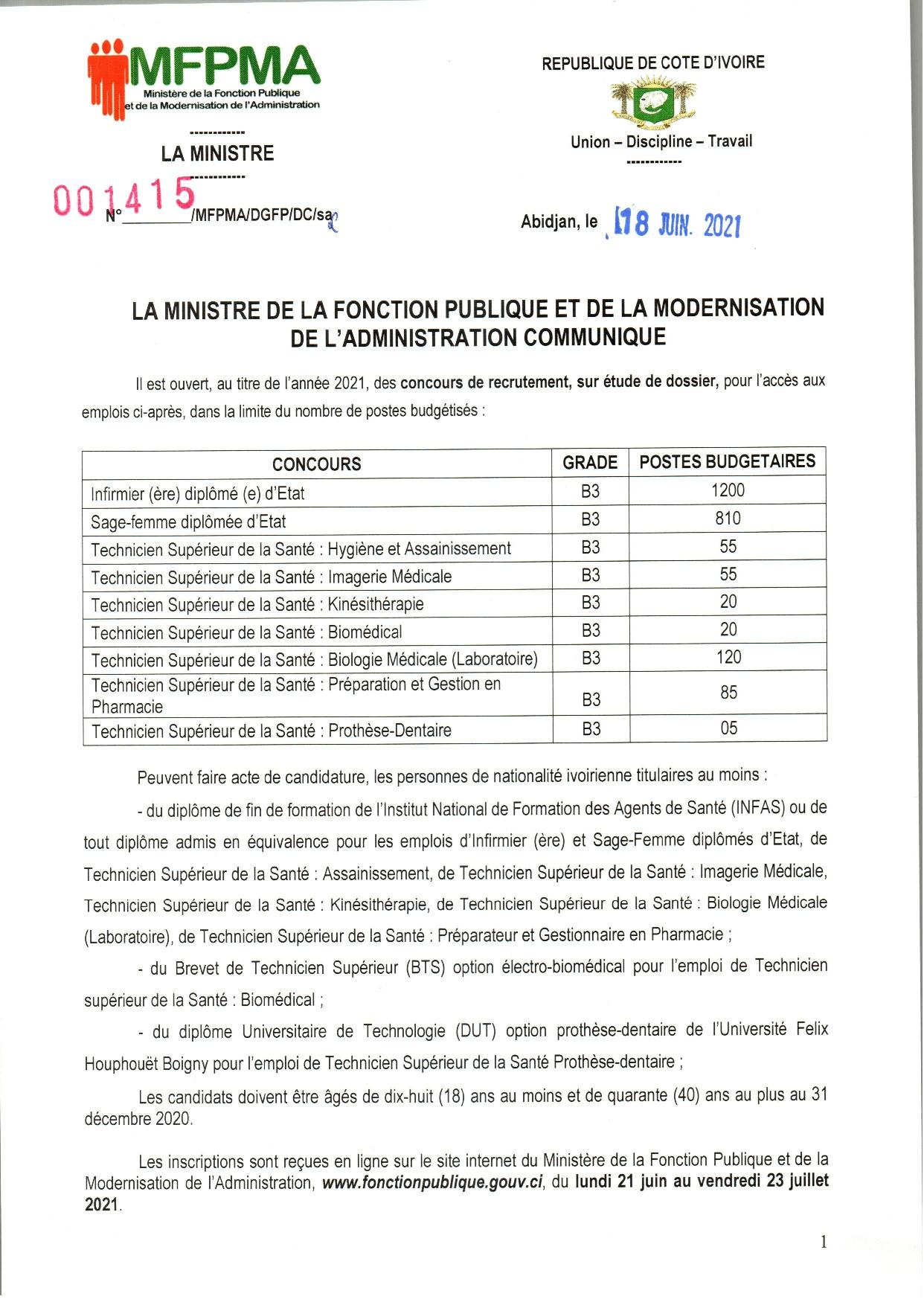 Communiqué | Concours de la fonction publique sur étude de dossiers: infirmiers, sages-femmes, technicien supérieur de la Santé (…)
