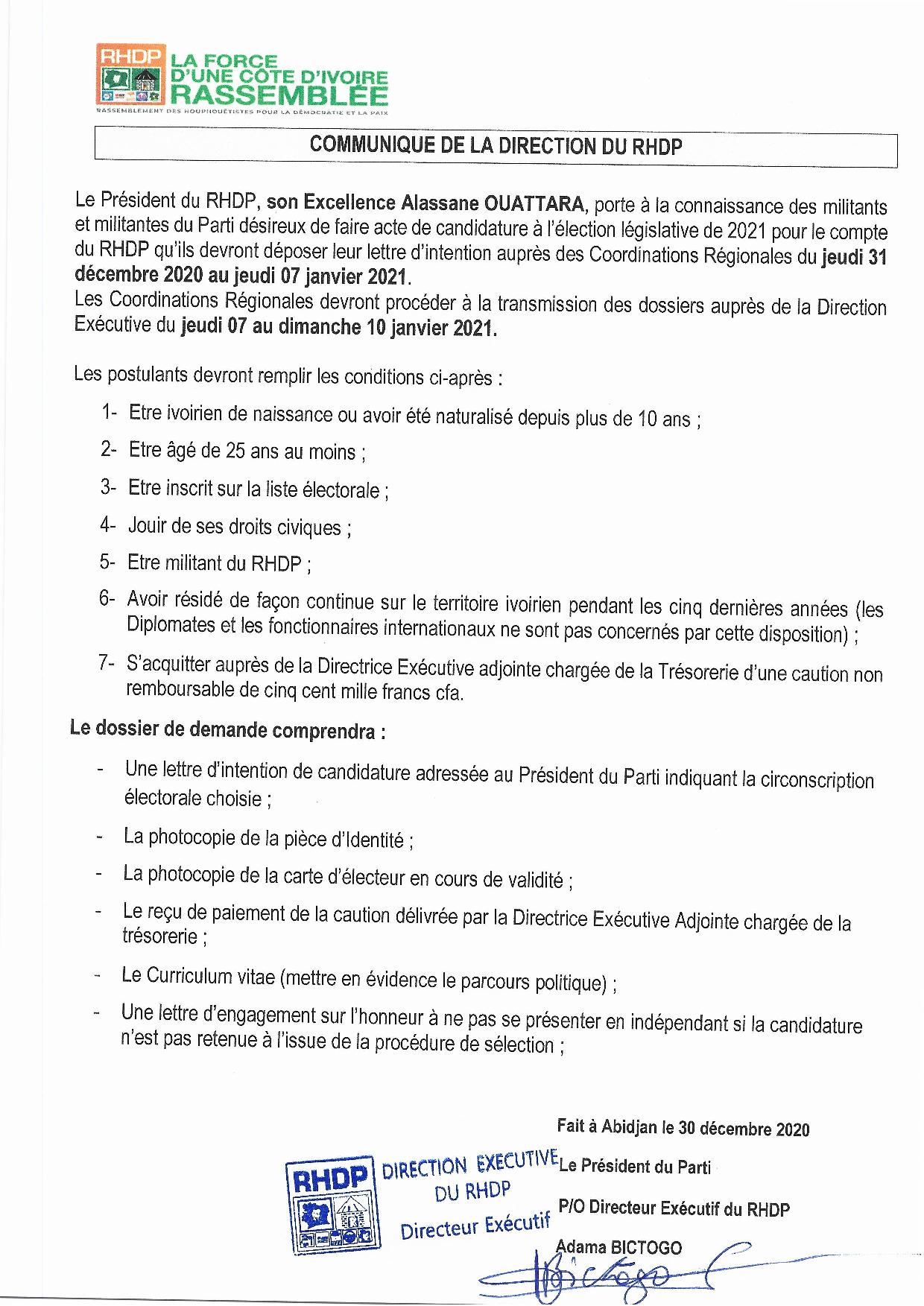 Communiqué | Voici les conditions pour être candidats du RHDP à l’élection législative de mars 2021