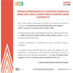 Dans le cadre du projet de construction de l’autoroute Y4, initié par l’Ageroute, la Compagnie Ivoirienne d’Électricité (CIE) procède à des travaux de rehaussement de la ligne haute tension KV Abobo-Alépé, et ce, du lundi 1er au dimanche 14 décembre 2025. Ces opérations entraîneront des perturbations dans la fourniture de l’électricité au sein de certaines localités. Ci-dessous le communiqué d’excuses de la direction générale de la CIE.