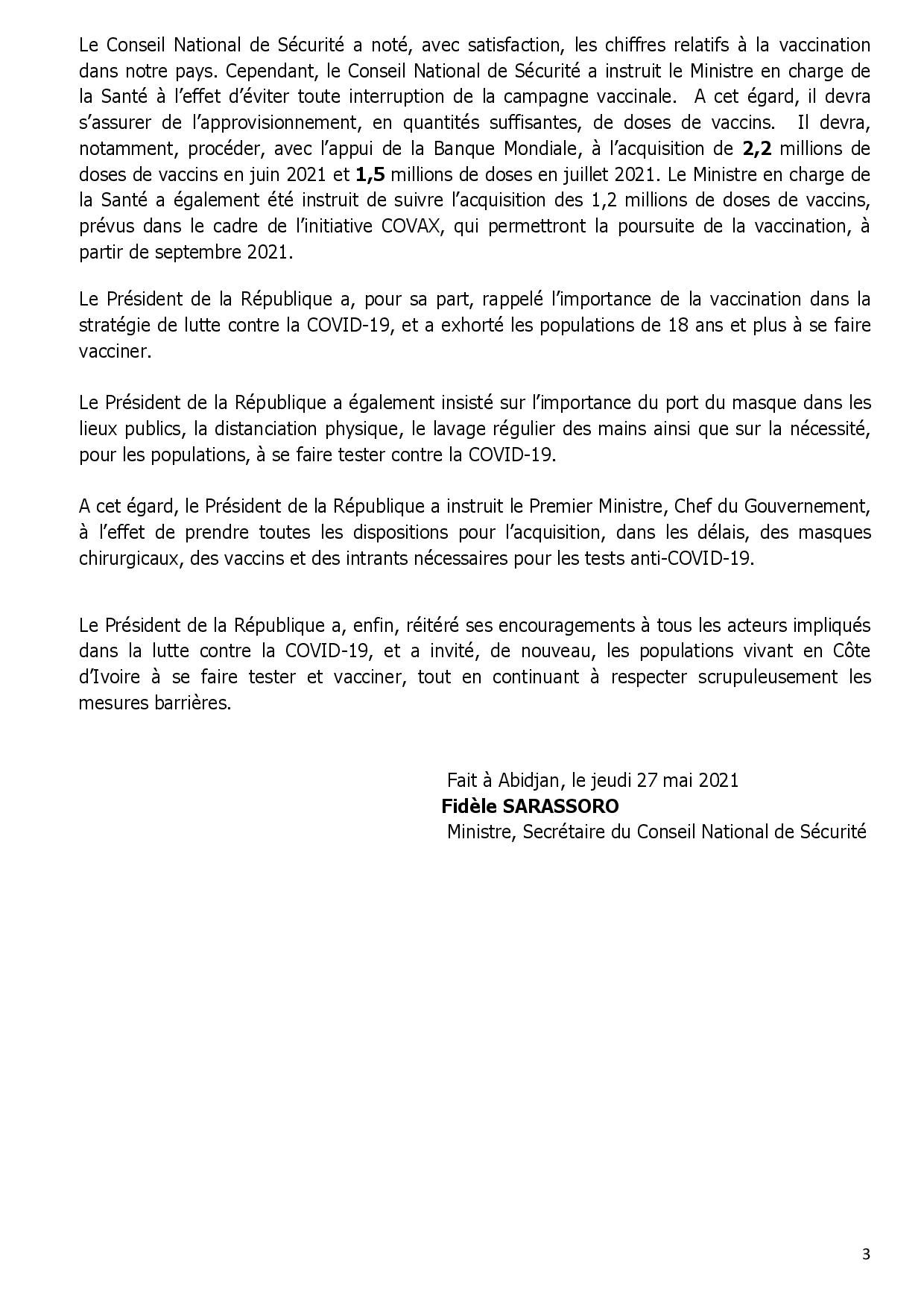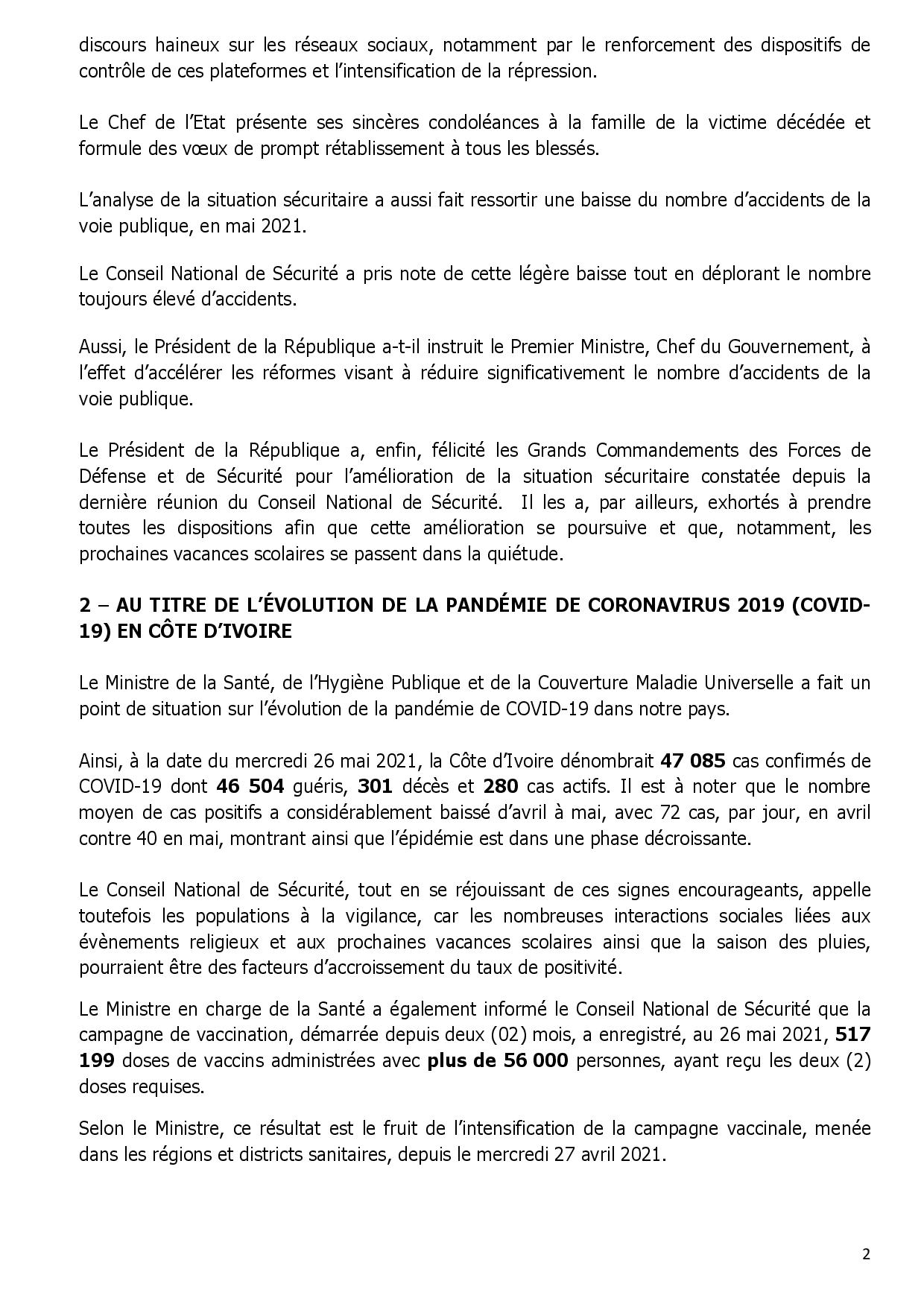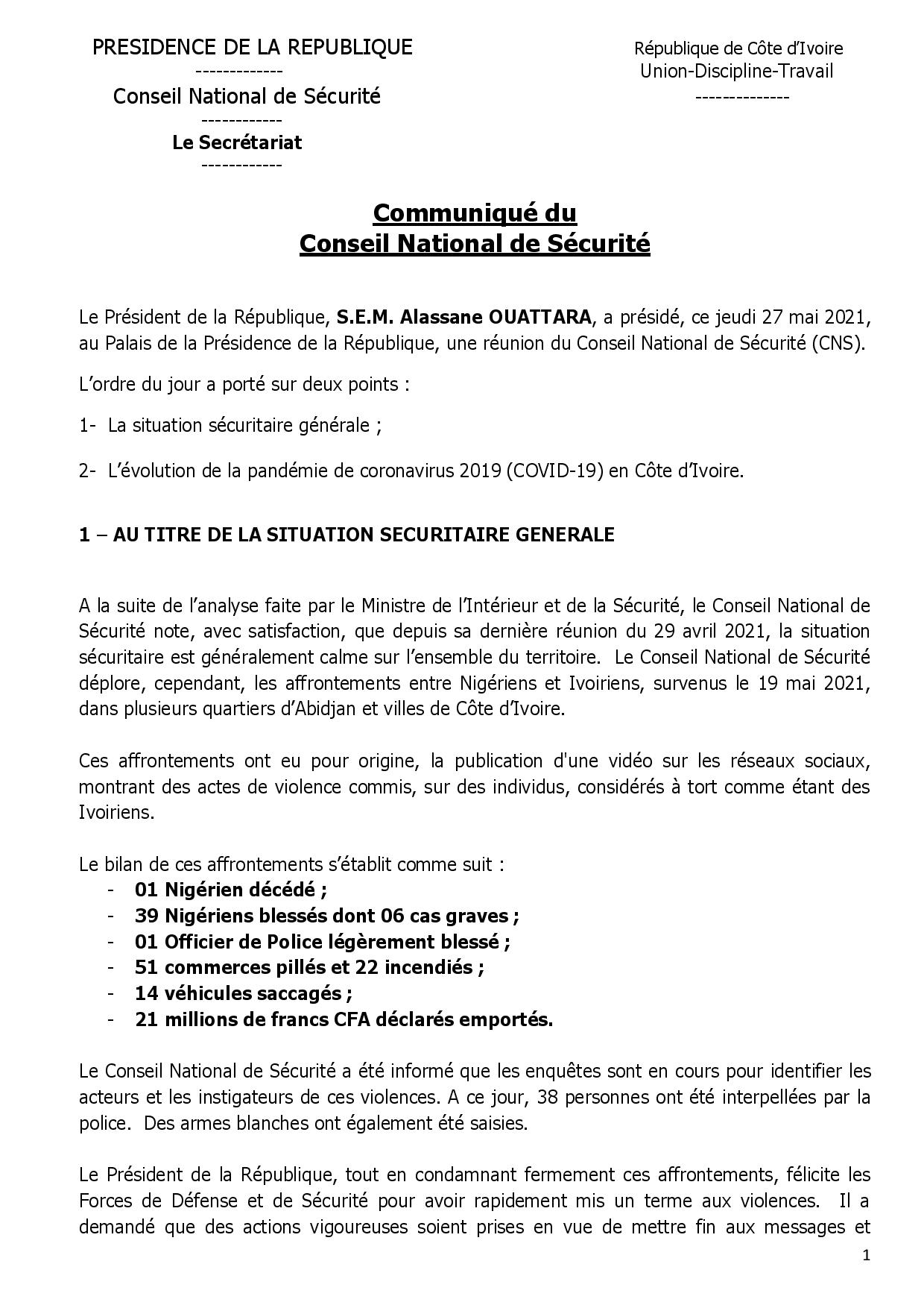 Actualité Côte d’Ivoire | Communiqué du Conseil National de Sécurité Publié 5 ans le 27 mai 2021 Par Redaction Share Tweet Tags:CommuniquéConseil national de sécurité A lire aussi Sécurité- Renforcement des frontières Nord et prolongation de la mesure d’interdiction de manifestation, voici les décisions du CNS Jacqueville – Événements d’Avagou/ Le Procureur de la République menace : ‘‘Tous les auteurs seront interpellés et jugés…’’ Réunion du CNS- Interdiction de meetings et manifestations publiques, Ouattara pour un scrutin présidentiel apaisé [Communiqué] DERNIERES INFO Filière cajou- Les producteurs du CACC-CI pour une prise de place dans la transformation industrielle 25 janvier 2026 Xiaomi renforce son leadership sur le segment milieu de gamme et célèbre le lancement du REDMI Note 15 en Côte d’Ivoire 24 janvier 2026 Transport aérien- Air Côte d’Ivoire accroît ses vols vers Paris et facilite le voyage entre Paris et Abidjan 22 janvier 2026 programme COCOAPERATION : Des résultats encourageants et une détermination commune à poursuivre le développement 20 janvier 2026 Assemblée nationale- Assalé Tiémoko veut plus de retransmission des activités parlementaires [Réaction] 17 janvier 2026 NOS PARTENAIRESLAURORE’ TAGSAbidjan (70) Affi N'guessan (125) Afrique (305) Ahmadou BAKAYOKO (72) Alassane Ouattara (810) Amadou Coulibaly (83) Amadou Koné (421) Angleterre (83) Bouaké (303) Burkina Faso (88) CEDEAO (111) CIE (136) Conseil des ministres (84) Covid-19 (150) Culture (71) Côte d'Ivoire (4639) Duekoue (83) Football (176) FPI (119) France (245) Gendarmerie Nationale (80) Guillaume Soro (125) Hamed Bakayoko (74) Henri Konan Bédié (148) justice (97) Laurent Gbagbo (223) Mali (134) Ministère de la Santé (82) ministère des Transports (228) ok (1972) Patrick Achi (244) PDCI-RDA (234) Pierre Dimba (76) police nationale (218) Politique (113) PPA-CI (118) RHDP (500) Santé (125) SODECI (103) Sport (172) Sécurité (120) Sécurité routière (77) top (84) Yamoussoukro (112) Éducation nationale (95)
