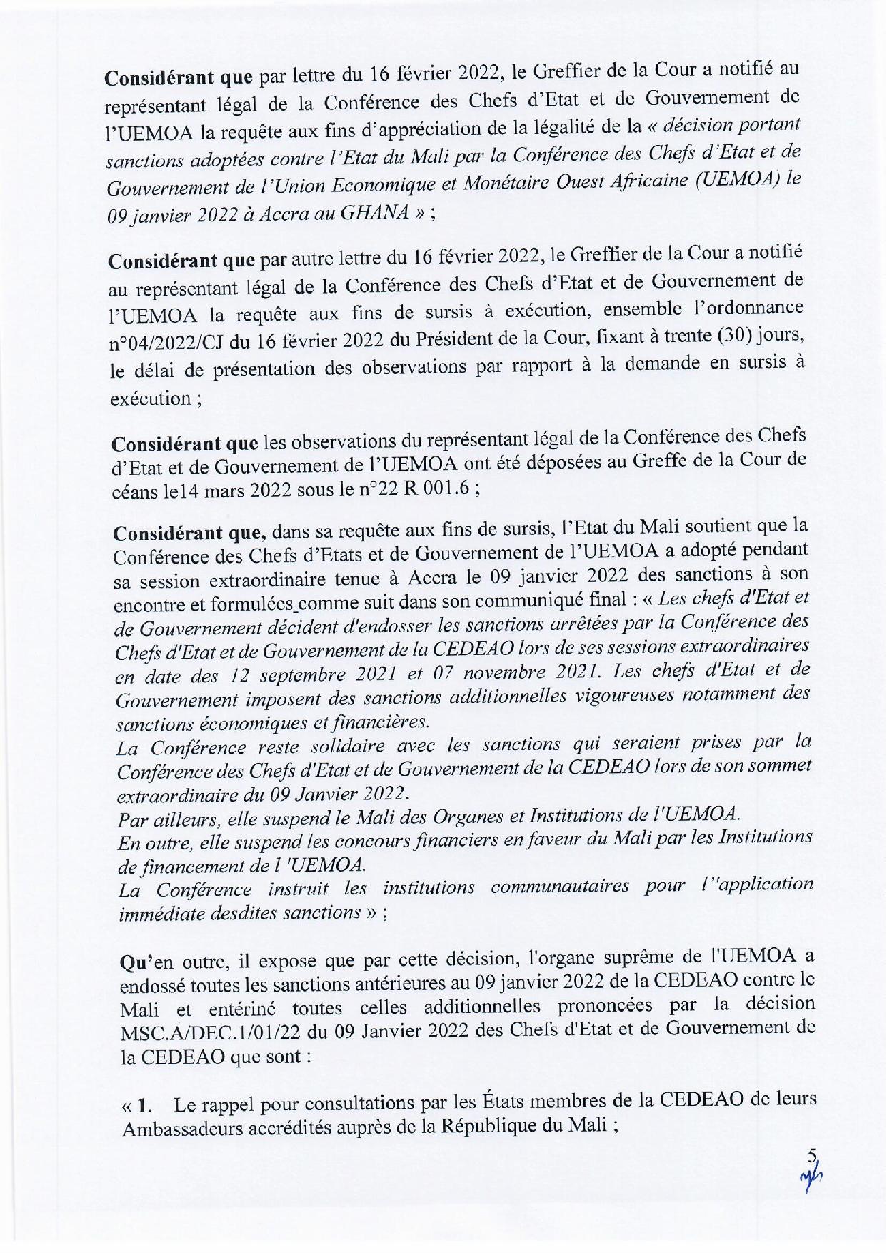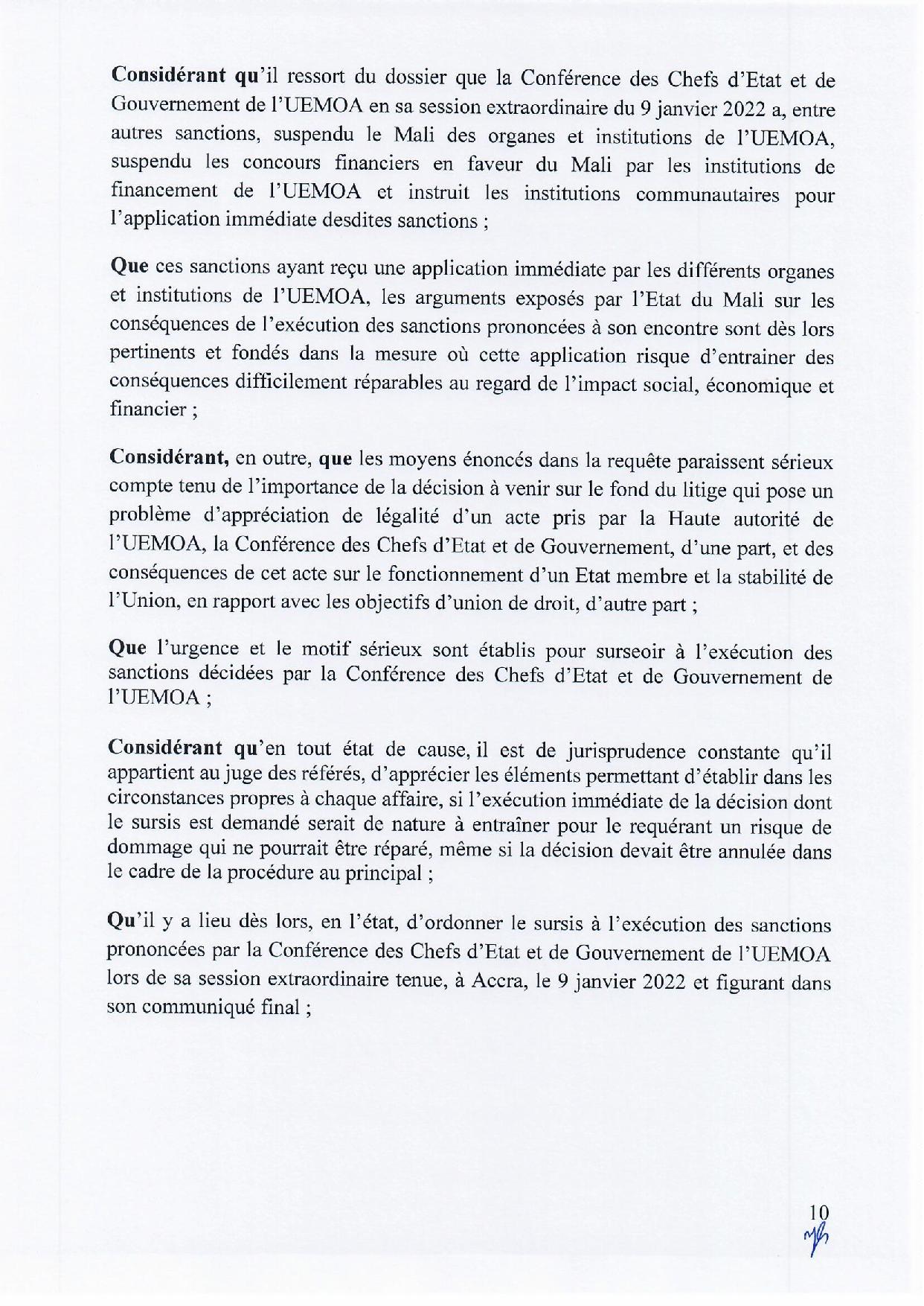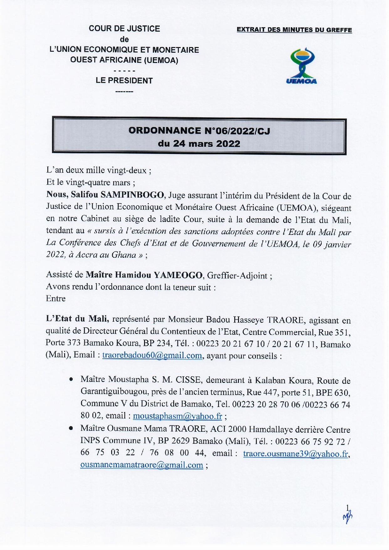 Crise malienne : la Cour de Justice de l’UEMOA prononce un sursis de l’exécution des sanctions financières, voici l’ordonnance