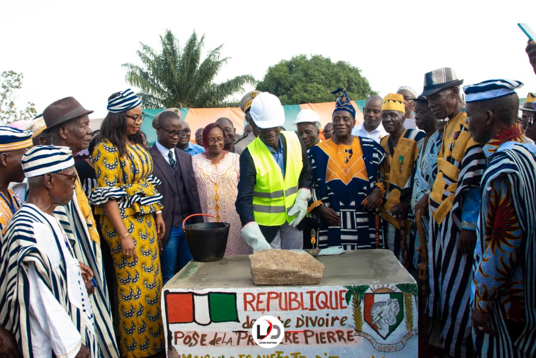 D’un coût global d’environ 100 millions de francs Cfa, la maison des chefs est un joyau architectural composé d’un grand bloc qui contient les bureaux (chefs de canton, chefs de tribu, chefs de terre et des chefs de communauté), une grande salle de plénière de 400 place assise et un podium de 20 m2, une petite salle de 60 places (salle multimédia), à côté du bâtiment principal, un bloc de 6 latrines, une grande salle qui va servir de dortoir de plus de 80 places, deux cases rondes (2 chambres sallons équipées) les hôtes de marque. Précisons qu’auparavant à Daleu, le ministre Vagondo Diomandé a félicité les femmes qui se sont constitué en Coopérative et s’est engagé à être à leur côté pour leur autonomisation, en offrant trois tricycles , un important don en numéraire et en posant la première pierre du marché de gros de ladite localité. Pour joindre l’acte à la parole, le ministre Vagondo Diomande a offert 5 tonnes de ciment pour le démarrage effectif des travaux.