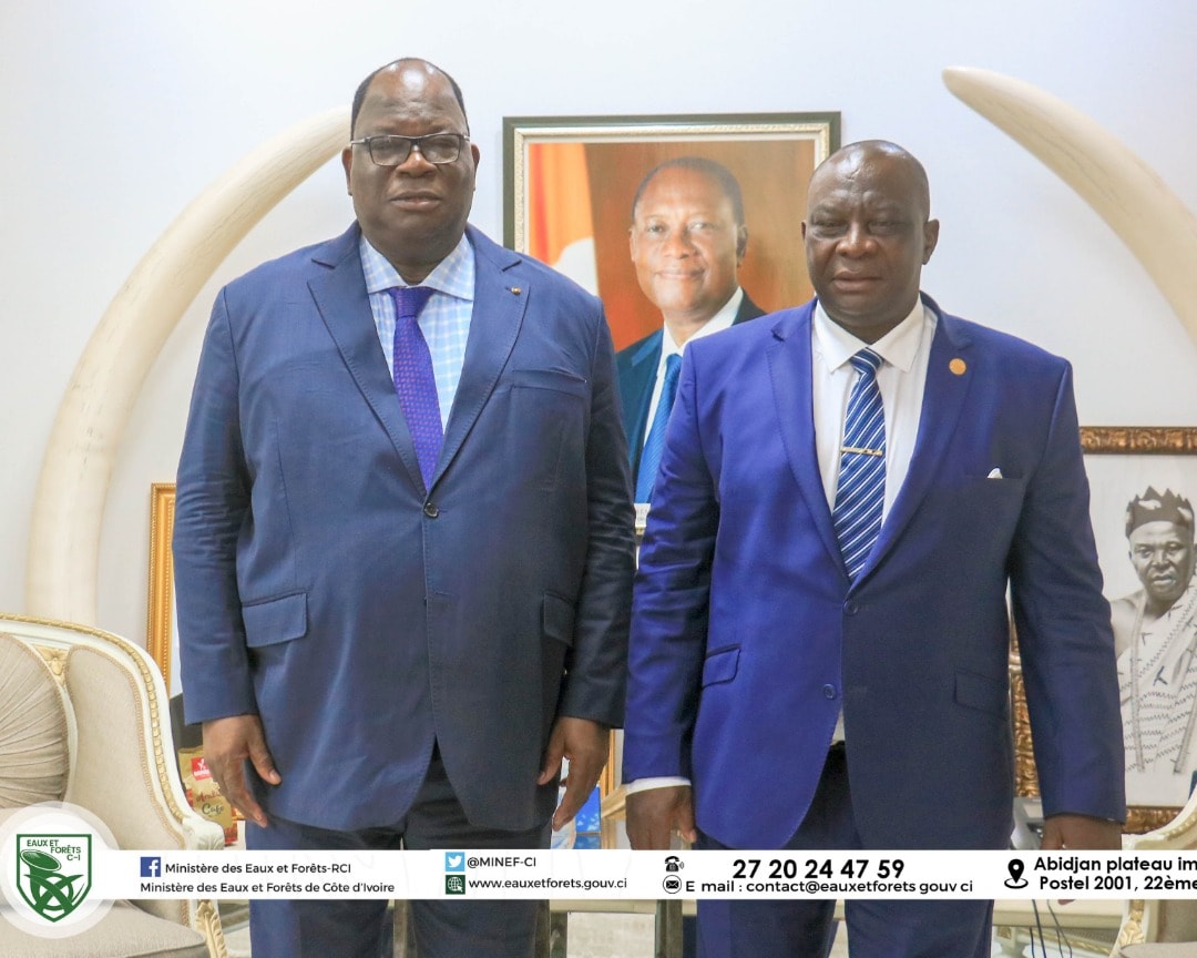 Dans la dynamique de se mettre ensemble pour définir les stratégies qui permettront de lutter efficacement contre la déforestation et promouvoir la cacaoculture durable, le Ministre des Eaux et Forêts, Monsieur Laurent TCHAGBA a été reçu par son collègue, le Ministre d’État, Ministre de l’Agriculture et du Développement Rural, Monsieur KOUASSI Kobenan Adjoumani, le mercredi 13 juillet 2022 à son cabinet pour une séance de travail.