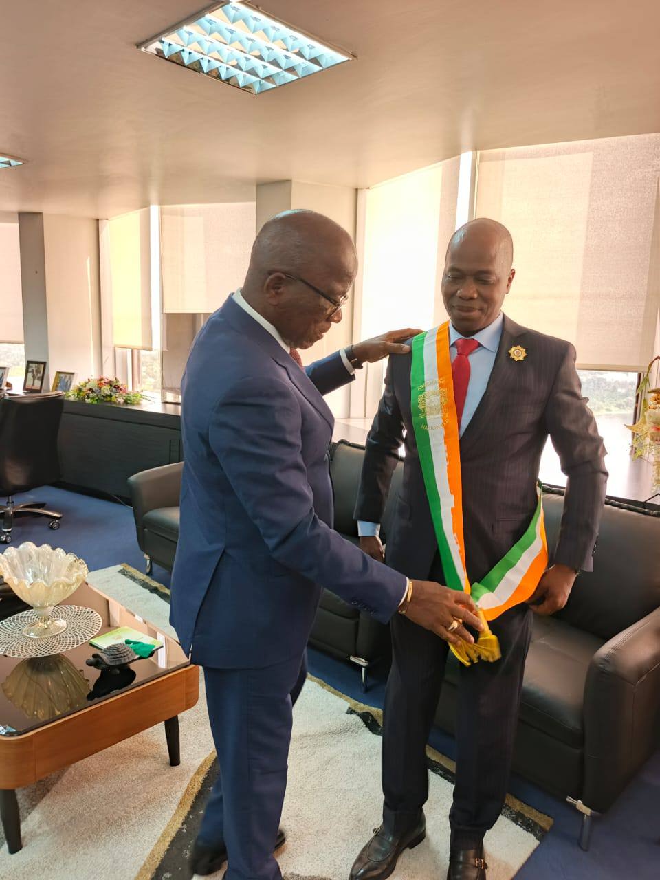 <<Le Vénérable René Koumoin , Ex Maire de Diabo et Sénateur de la région du Gbèké s’est fait remette ses attributs de Député de la nation par le Ministre Assahoré Jacques. En effet, reconduit au poste de ministre des eaux et forêts, Mr Jacques Assahoré a cédé son titre de Député à son suppléant qui devient ainsi le Député officiel de la circonscription de Diabo. Merci à tous pour vos prières, c’est le peuple Gblo qui gagne>> a posté Kouassi Nelva la Choisie.