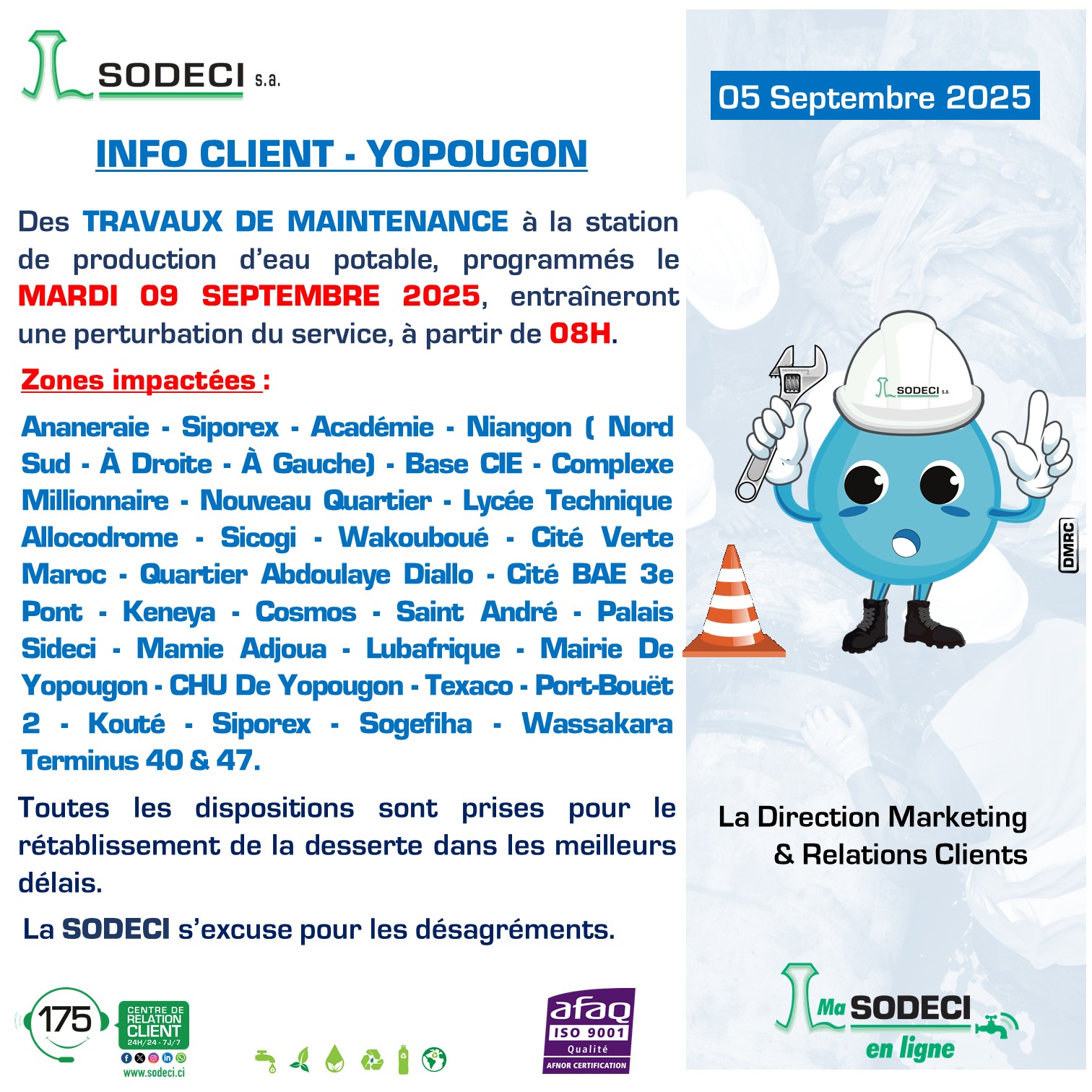 La SODECI rassure que << toutes les dispositions sont prises pour le rétablissement de la desserte dans les meilleurs délais>> et s’excuse pour les désagréments. Le 175 est disponible pour toutes informations nécessaires.