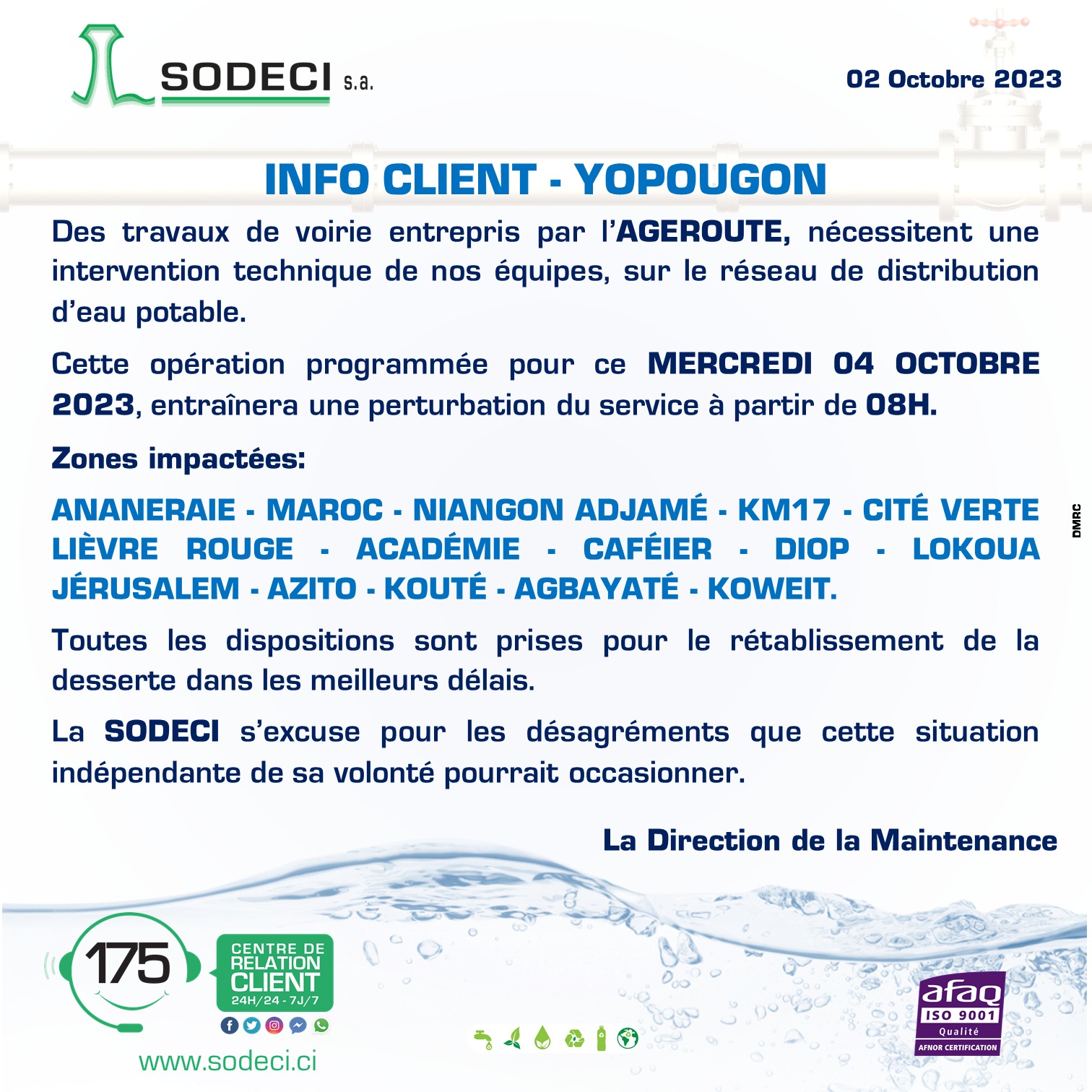 Les quartiers de Yopougon, Ananeraie, Maroc, niangon adjamé, Km 17, cité verte, lièvre rouge, académie, caféier, Diop, lokoua, Jérusalem, Azito, Kouté, Agbayaté et Koweït subiront une ” perturbation du service à partir de 8h” ce mercredi 4 octobre 2023.