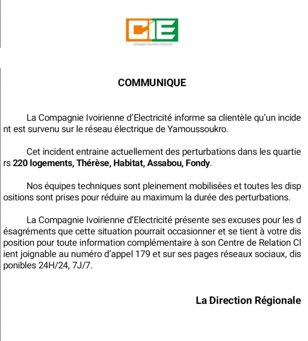 Actualité Electricité- La CIE à pied d’œuvre pour le retour rapide du courant à Yamoussoukro Publié 12 heures le 6 mars 2026 Par Redaction Share Tweet Un incident technique est survenu sur le réseau électrique à Yamoussoukro. Ci-dessous le communiqué. Tags:CIECôte d'Ivoiremobilisation équipes techniques CIEokPerturbation électriqueYamoussoukro A lire aussi Yamoussoukro- La SODECI rassure la clientèle après une perturbation électrique qui impacte la fourniture en eau potable Sécurité routière- Amadou KONE décrète la tolérance zéro pour discipliner les automobilistes et réduire les accidents Sécurité routière- Le Sénégal s’inspire de l’exemple ivoirien de lutte contre l’incivisme routier et des projets de transport DERNIERES INFO Yamoussoukro- La SODECI rassure la clientèle après une perturbation électrique qui impacte la fourniture en eau potable 6 mars 2026 Electricité- La CIE à pied d’œuvre pour le retour rapide du courant à Yamoussoukro 6 mars 2026 Sécurité routière- Amadou KONE décrète la tolérance zéro pour discipliner les automobilistes et réduire les accidents 6 mars 2026 Sécurité routière- Le Sénégal s’inspire de l’exemple ivoirien de lutte contre l’incivisme routier et des projets de transport 6 mars 2026 Réseau électrique- Le gouvernement rassure avec un plan de modernisation engagé face aux consommations à la hausse 5 mars 2026 NOS PARTENAIRESLAURORE’ TAGSAbidjan (73) Affi N'guessan (125) Afrique (306) Ahmadou BAKAYOKO (72) Alassane Ouattara (813) Amadou Coulibaly (84) Amadou Koné (430) Angleterre (83) Bouaké (306) Burkina Faso (88) CEDEAO (114) CIE (145) Conseil des ministres (84) Covid-19 (151) Culture (71) Côte d'Ivoire (4682) Duekoue (84) Football (177) FPI (119) France (245) Gendarmerie Nationale (80) Guillaume Soro (125) Hamed Bakayoko (74) Henri Konan Bédié (148) justice (98) Laurent Gbagbo (223) Mali (134) Ministère de la Santé (83) ministère des Transports (228) ok (2047) Patrick Achi (244) PDCI-RDA (241) Pierre Dimba (76) police nationale (218) Politique (120) PPA-CI (118) RHDP (509) Santé (128) SODECI (109) Sport (172) Sécurité (120) Sécurité routière (83) top (84) Yamoussoukro (121) Éducation nationale (96)