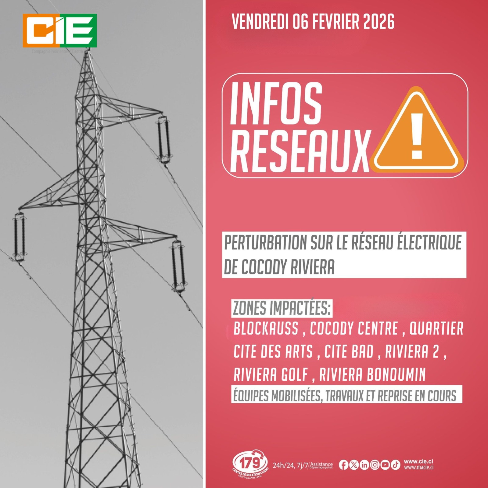 La population de la commune de Cocody précisément du secteur de la Riviera va connaître une perturbation sur le réseau électrique. C est la CIE qui donne l’information ce vendredi 6 février.