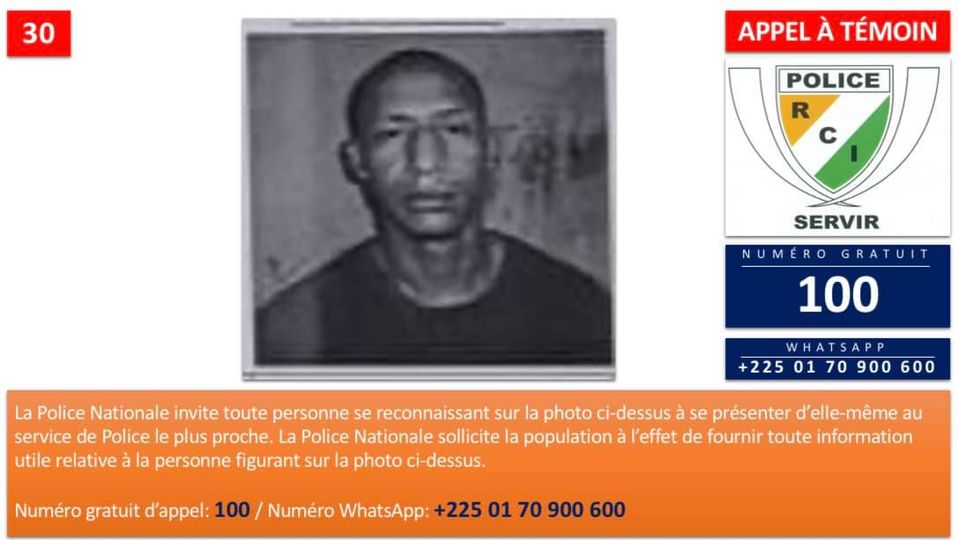 Les numéros de téléphone pour signaler cet individu en cavale sont le “Numéro gratuit d’appel: 100 et le numéro WhatsApp: +225 01 70 900 600”.