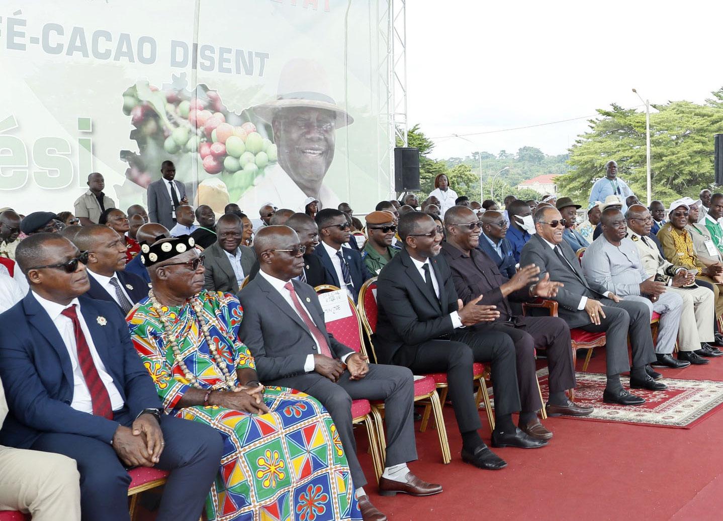 Le Premier Ministre Patrick Achi a présidé ce samedi 04 juin 2022 à Yamoussoukro, une journée d’hommage et de reconnaissance des planteurs de café-cacao de Côte d’Ivoire au Président Alassane Ouattara pour toutes ses actions de développement en faveur du monde agricole et des organisations des producteurs de café-cacao.