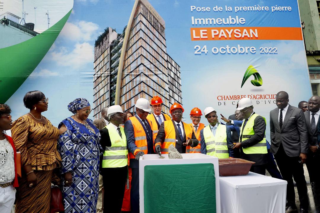 Le ministre d’État, ministre de l’Agriculture et du Développement rural, Kobenan Kouassi Adjoumani, a procédé, le lundi 24 octobre à Abidjan-Plateau, à la pose de la première pierre de l’immeuble “Le Paysan”, une double tour de 20 étages devant abriter la Chambre nationale de l’Agriculture et plusieurs structures de l’écosystème agricole.