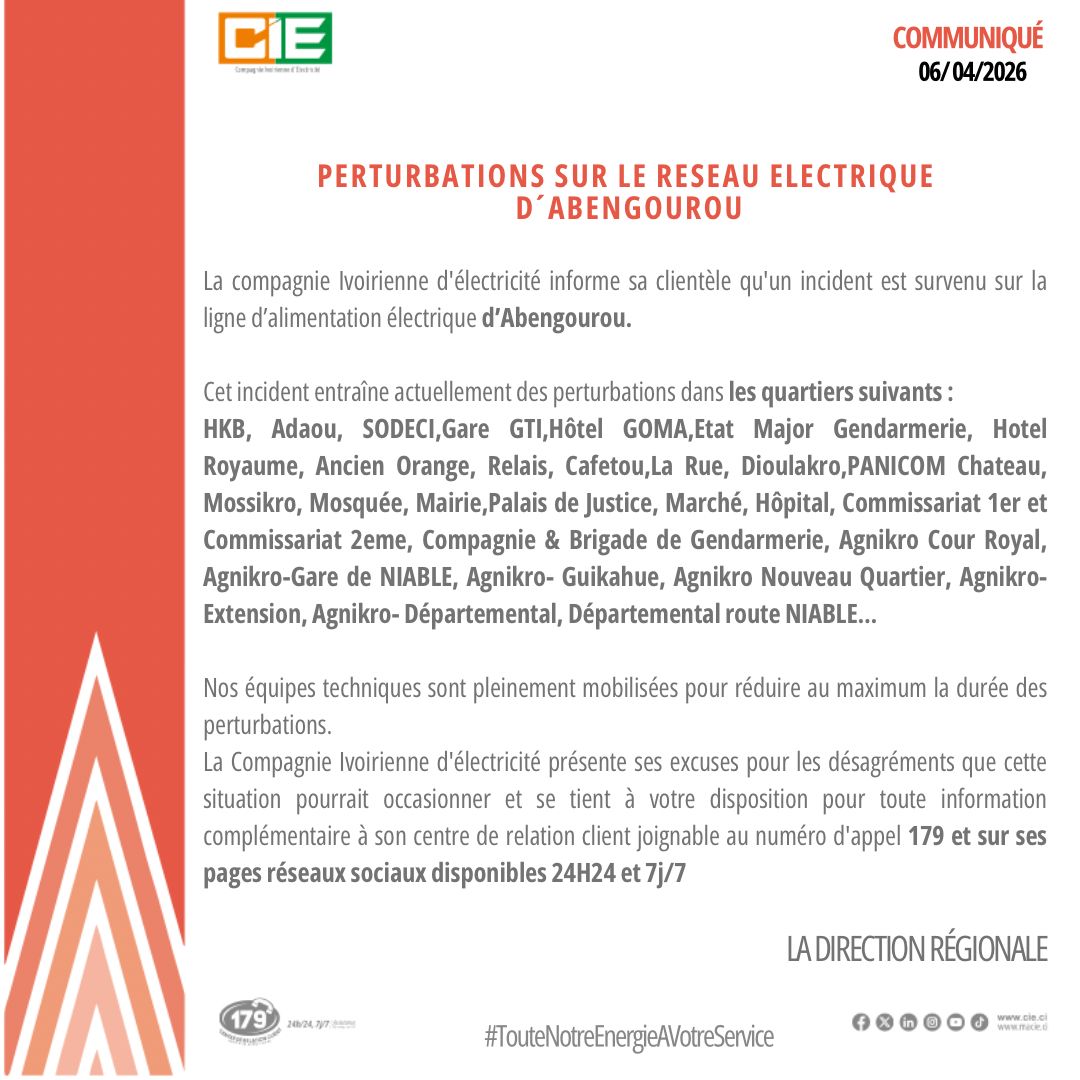 Une partie de la population de la ville d’Abengourou est momentanément sans courant électrique. La cause, c’est la Compagnie Ivoirienne d’ Electricité qui la fournit à travers un communiqué portant << perturbations sur le réseau électrique d Abengourou>> dans lequel il est fait cas d’ <<incident [qui] entraine actuellement des perturbations dans les quartiers HKB, Adaou, SODECI, Gare GTI, Hotel Goma, Etat major Gendarmerie, Hôtel Royaume, Ancien Orange, Relais, Cafetou, la Rue, Dioulakro, PANICOM, Château, Mossikro, Mosquée, Mairie, Palais de Justice, Marché, Hôpital, Commissariat er arrondissement et commissariat 2è arrondissement, Compagnie et Brigade Gendarmerie, Agnikro Cour royale, Agnikro gare de Niablé, Agnikro Guikahué, Agnikro Nouveau quartier, Agnikro Extension, Agnikro départemental, Départemental route Niablé.>>