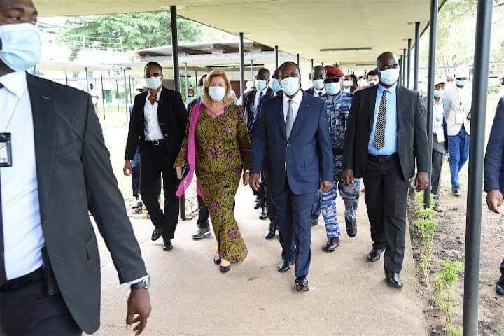 Le Président Ouattara était accompagné, à son lieu de vote du lycée Sainte Marie (Cocody), de son épouse Dominique Ouattara, du Premier Ministre Hamed Bakayoko.