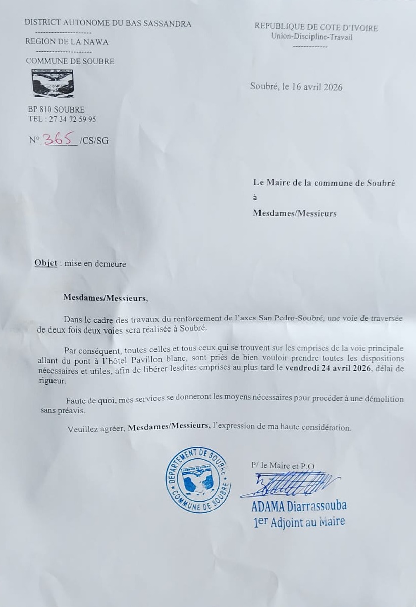 Signée d’Adama Diarrassouba, 1e adjoint au Maire de la commune de Soubré, la mise en demeure stipule que « dans le cadre des travaux de renforcement de l’axe San-Pedro-Soubré, une voie de traversée de deux (02) fois deux (02) voies sera réalisée à Soubré. Par conséquent, toutes celles et tous ceux qui se trouvent sur l’emprise de la voie principale allant du pont à l’hôtel Pavillon blanc sont priés de bien vouloir prendre toutes les dispositions nécessaires et utiles afin de libérer lesdites emprises au plus tard le vendredi 24 avril 2026, délai de rigueur. Faute de quoi, mes services se donneront les moyens nécessaires pour procéder à une démolition sans préavis », a écrit le deuxième magistrat de la commune de Soubré, qui signe par ordre du Maire.