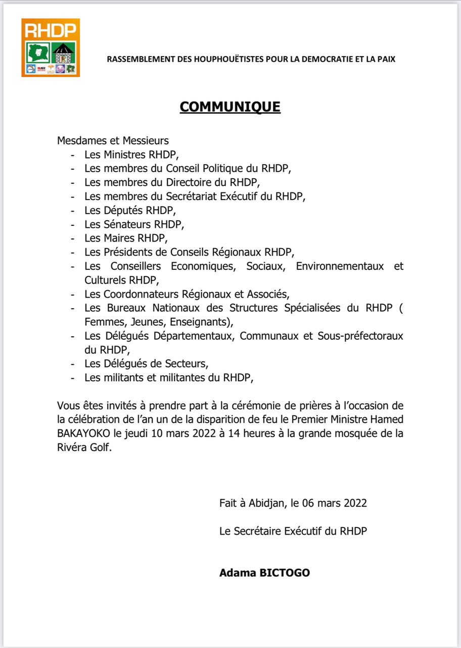 Actualité RHDP-Adama Bictogo convie les cadres de son parti à une prière pour Hamed BAKAYOKO Publié 4 ans le 7 mars 2022 Par Redaction Share Tweet Tags:Adama Bictogoconvie les cadresHamed BakayokoRHDP A lire aussi Assemblée nationale- Assalé Tiémoko veut plus de retransmission des activités parlementaires [Réaction] Politique- Députés Indépendants au RHDP, non…Nabil Ballo tente l’approche avec pour avocat Kandia Camara Après sa défaite électorale : Ibrahim Konaté (Rhdp) se bat pour ériger Port-Bouët, en bastion du pouvoir DERNIERES INFO Filière cajou- Les producteurs du CACC-CI pour une prise de place dans la transformation industrielle 25 janvier 2026 Xiaomi renforce son leadership sur le segment milieu de gamme et célèbre le lancement du REDMI Note 15 en Côte d’Ivoire 24 janvier 2026 Transport aérien- Air Côte d’Ivoire accroît ses vols vers Paris et facilite le voyage entre Paris et Abidjan 22 janvier 2026 programme COCOAPERATION : Des résultats encourageants et une détermination commune à poursuivre le développement 20 janvier 2026 Assemblée nationale- Assalé Tiémoko veut plus de retransmission des activités parlementaires [Réaction] 17 janvier 2026 NOS PARTENAIRESLAURORE’ TAGSAbidjan (70) Affi N'guessan (125) Afrique (305) Ahmadou BAKAYOKO (72) Alassane Ouattara (810) Amadou Coulibaly (83) Amadou Koné (421) Angleterre (83) Bouaké (303) Burkina Faso (88) CEDEAO (111) CIE (136) Conseil des ministres (84) Covid-19 (150) Culture (71) Côte d'Ivoire (4639) Duekoue (83) Football (176) FPI (119) France (245) Gendarmerie Nationale (80) Guillaume Soro (125) Hamed Bakayoko (74) Henri Konan Bédié (148) justice (97) Laurent Gbagbo (223) Mali (134) Ministère de la Santé (82) ministère des Transports (228) ok (1972) Patrick Achi (244) PDCI-RDA (234) Pierre Dimba (76) police nationale (218) Politique (113) PPA-CI (118) RHDP (500) Santé (125) SODECI (103) Sport (172) Sécurité (120) Sécurité routière (77) top (84) Yamoussoukro (112) Éducation nationale (95)