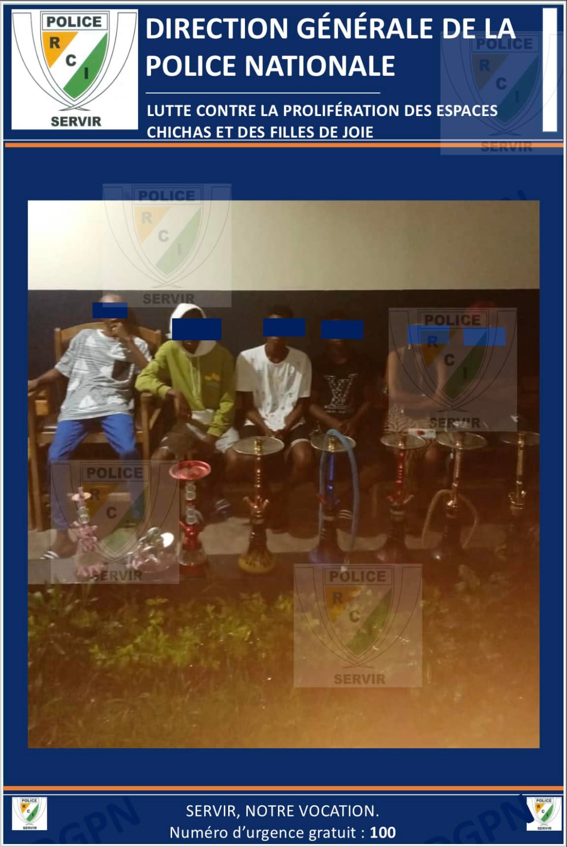 “Dans le cadre de la lutte contre la prolifération des chichas et les filles de joie, la Police Nationale a mené une patrouille dans le district d’Adjamé” dont les résultats ont été communiqués le 25 juin 2022 et révèlent que “44 chichas ont été saisies, 21 consommateurs interpellés et 03 de filles de joie” interpellées.
