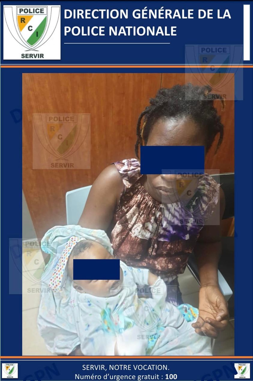 “Aussitôt, une équipe de la cellule kidnapping ou enlèvement s’est mise en place pour retrouver le bébé volé. Aux environs de 19H, dame AAG, 42 ans, sans emploi a été interpellée à son domicile à Abobo Belle-ville avec l’enfant” a fait savoir la Police.