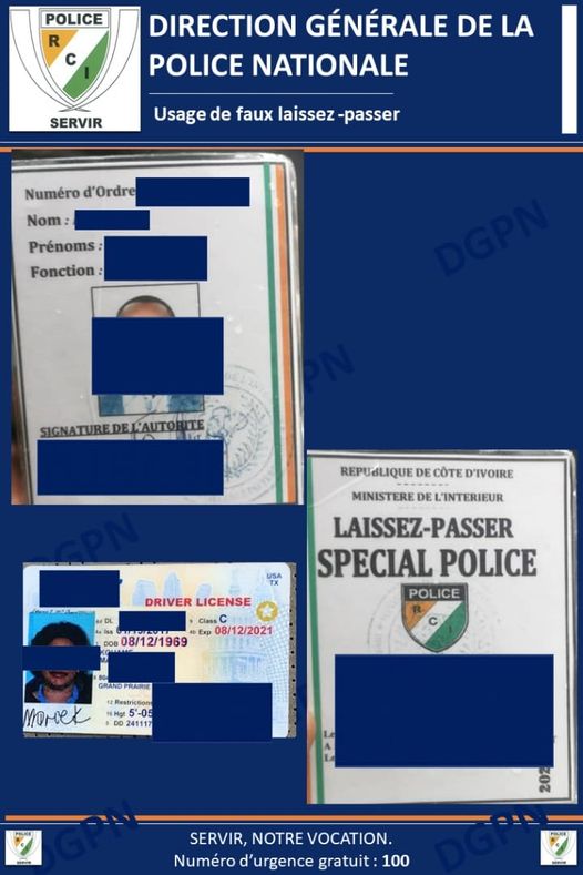 La Police ivoirienne indique avoir mis le grappin sur une femme qui circulait avec un faux laissez-passer de Police. Interpellée, elle a été conduite dans un commissariat de police pour nécessité d’enquête. Depuis quelques semaines, la Police nationale a lancé la traque aux véhicules aux vitres teintées et plaques d’immatriculation non conformes.