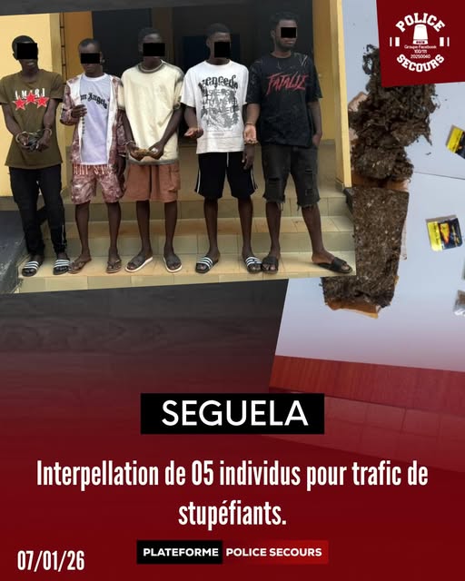 D H , alias Messi, 30 ans, domicilié au quartier Haoussabougou ; S L, alias Du, 20 ans, domicilié au quartier Soumahorokaha ; F I, alias La Bombe, 25 ans, domicilié au quartier Angola et T M K, 21 ans, domicilié au quartier Djelisso sont des individus ont été épinglés par la Police nationale sur dénonciation anonyme liée à un trafic de drogue. Ils sont tombés dans les mailles des filets de la Police nationale à Séguéla après l’interpellation D.G., 27 ans, surnommé Mineur , un surnom aux antipodes avec ses activités répréhensibles. Ce réseau est tombé le mardi 30 décembre 2025.