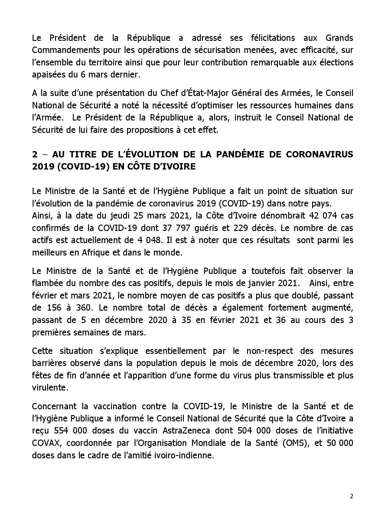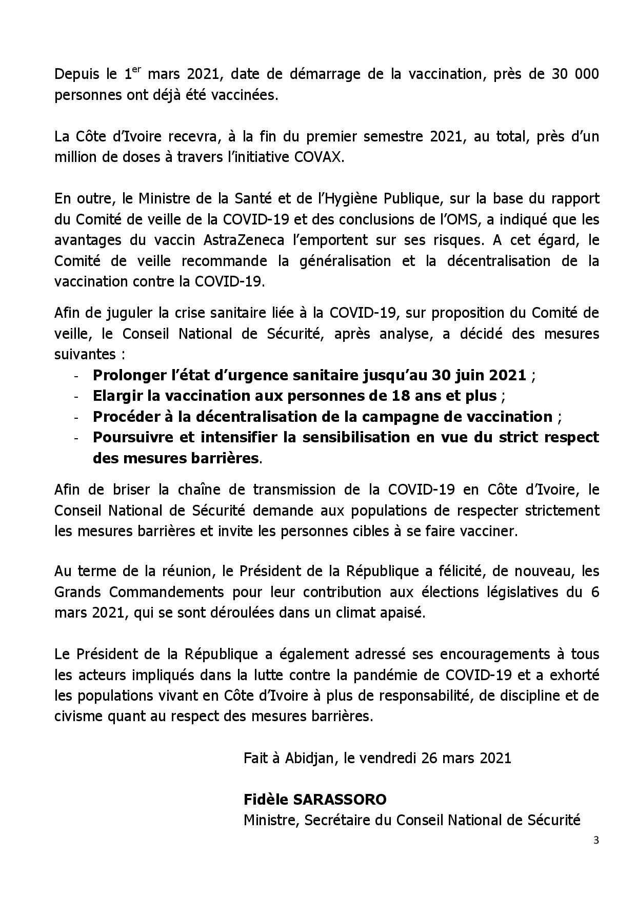 Actualité Situation sécuritaire- Prorogation de l’état d’urgence et ouverture de la vaccination aux 18 ans et plus Publié 5 ans le 27 mars 2021 Par Redaction Share Tweet Tags:Prorogation de l'état d'urgenceSituation sécuritairevaccination aux 18 ans A lire aussi Réunion- Le Conseil National de Sécurité lève l’état d’urgence sanitaire dû à la Covid 19, les principales décisions Sécurité et Santé- Une nouvelle réunion du CNS sur la situation sécuritaire et la Covid-19 Communiqué conjoint sur la situation sécuritaire au Mali DERNIERES INFO Filière cajou- Les producteurs du CACC-CI pour une prise de place dans la transformation industrielle 25 janvier 2026 Xiaomi renforce son leadership sur le segment milieu de gamme et célèbre le lancement du REDMI Note 15 en Côte d’Ivoire 24 janvier 2026 Transport aérien- Air Côte d’Ivoire accroît ses vols vers Paris et facilite le voyage entre Paris et Abidjan 22 janvier 2026 programme COCOAPERATION : Des résultats encourageants et une détermination commune à poursuivre le développement 20 janvier 2026 Assemblée nationale- Assalé Tiémoko veut plus de retransmission des activités parlementaires [Réaction] 17 janvier 2026 NOS PARTENAIRESLAURORE’ TAGSAbidjan (70) Affi N'guessan (125) Afrique (305) Ahmadou BAKAYOKO (72) Alassane Ouattara (810) Amadou Coulibaly (83) Amadou Koné (421) Angleterre (83) Bouaké (303) Burkina Faso (88) CEDEAO (111) CIE (136) Conseil des ministres (84) Covid-19 (150) Culture (71) Côte d'Ivoire (4639) Duekoue (83) Football (176) FPI (119) France (245) Gendarmerie Nationale (80) Guillaume Soro (125) Hamed Bakayoko (74) Henri Konan Bédié (148) justice (97) Laurent Gbagbo (223) Mali (134) Ministère de la Santé (82) ministère des Transports (228) ok (1972) Patrick Achi (244) PDCI-RDA (234) Pierre Dimba (76) police nationale (218) Politique (113) PPA-CI (118) RHDP (500) Santé (125) SODECI (103) Sport (172) Sécurité (120) Sécurité routière (77) top (84) Yamoussoukro (112) Éducation nationale (95)