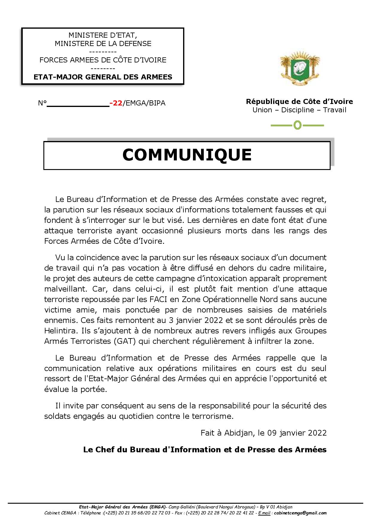 Actualité Terrorisme en Côte d’Ivoire : Le Bureau d’Information et de la Presse des Armées dément les rumeurs sur les évènements de Thiéni Publié 4 ans le 10 janvier 2022 Par Redaction Share Tweet Tags:évènements de ThiéniPresse des Armées A lire aussi DERNIERES INFO Xiaomi renforce son leadership sur le segment milieu de gamme et célèbre le lancement du REDMI Note 15 en Côte d’Ivoire 24 janvier 2026 Transport aérien- Air Côte d’Ivoire accroît ses vols vers Paris et facilite le voyage entre Paris et Abidjan 22 janvier 2026 programme COCOAPERATION : Des résultats encourageants et une détermination commune à poursuivre le développement 20 janvier 2026 Assemblée nationale- Assalé Tiémoko veut plus de retransmission des activités parlementaires [Réaction] 17 janvier 2026 Affaire 541 ha d’Akoupé-Zeudji ׀ Touré Ahmed Bouah et Amon Amon Athanas : Une confrontation loin de prendre fin 16 janvier 2026 NOS PARTENAIRESLAURORE’ TAGSAbidjan (70) Affi N'guessan (125) Afrique (305) Ahmadou BAKAYOKO (72) Alassane Ouattara (810) Amadou Coulibaly (83) Amadou Koné (421) Angleterre (83) Bouaké (303) Burkina Faso (88) CEDEAO (111) CIE (136) Conseil des ministres (84) Covid-19 (150) Culture (71) Côte d'Ivoire (4638) Duekoue (83) Football (176) FPI (119) France (245) Gendarmerie Nationale (80) Guillaume Soro (125) Hamed Bakayoko (74) Henri Konan Bédié (148) justice (97) Laurent Gbagbo (223) Mali (134) Ministère de la Santé (82) ministère des Transports (228) ok (1971) Patrick Achi (244) PDCI-RDA (234) Pierre Dimba (76) police nationale (218) Politique (113) PPA-CI (118) RHDP (500) Santé (125) SODECI (103) Sport (172) Sécurité (120) Sécurité routière (77) top (84) Yamoussoukro (112) Éducation nationale (95)