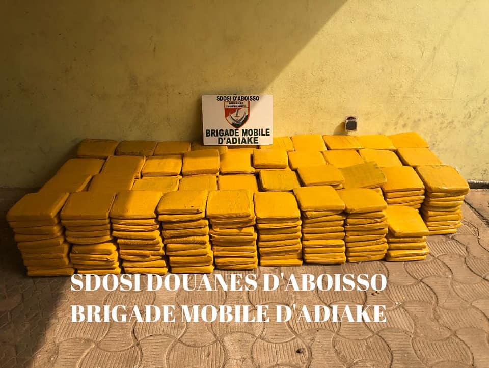 “Aux environs de 12h30, les agents de la Brigade Mobile d’Adiaké ont procédé à la saisie de 05 colis contenant 385 plaquettes de cannabis d’un poids total de 308 kg à Allohouré dans la zone d’Adiaké” rapporte une note d’information des Douanes ivoiriennes.