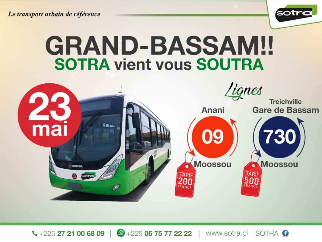 “Monsieur COULIBLALY Tiémoko Ibrahim, Directeur de la Division de la Production, représentant le Directeur Général de la SOTRA, a confirmé l’effectivité du démarrage des activités du transporteur urbain à Bassam” indique la Sotra. Deux lignes, le 09 et le 730, seront les bus qui assureront la desserte de Grand Bassam. La “ligne 09 part du terminus de Moossou pour Anani, le tout sur une distance de 19km au tarif social de 200 FCFA. Et la ligne 730, longue de 37, 5 km (avec deux terminus: Moossou et Hôpital général de Bassam), fera la liaison entre Grand Bassam et Treichville, gare de Bassam au prix de 500 FCFA” annonce la Sotra.