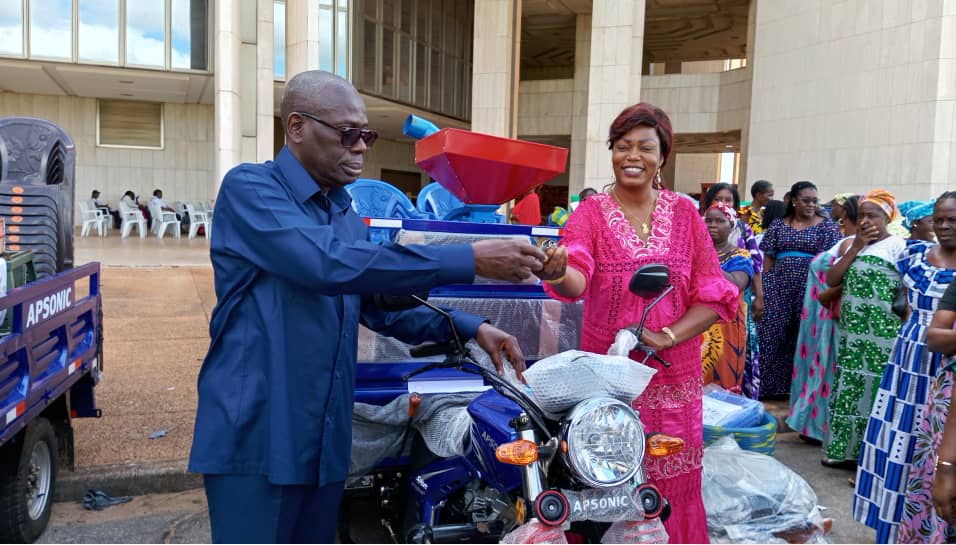 Le don est composé de tricycles, congélateurs, glacières, chaises, machines à coudre, seaux, bottes et poubelles, destinés à dix-huit associations féminines de la ville. Ces matériels devront permettre de renforcer les activités génératrices de revenus des femmes du district.
