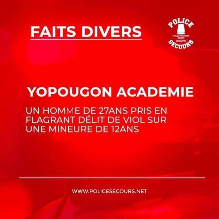 Un homme de 27ans aurait été pris en flagrant délit de viol sur la nièce de 12 ans de sa bienfaitrice le mardi 13 octobre dernier dans la commune de Yopougon ( Abidjan nord), selon la page Facebook de Police Secours.